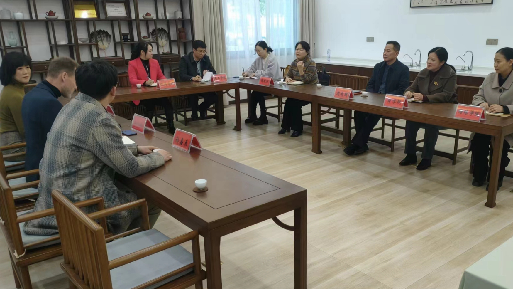 11月16日下午,荷兰布雷达应用科技大学环境与物流学院国际化工作负责人Don Guikink、国际业务负责人朱玉衡、校方代表孙嘉禾来校访问。在对建筑工程学院实训中心、语传学院校园电视台、旅游学院模拟仿真旅行社和茶艺课堂实地考察之后,Don Guikink一行来到商学院实训中心和各学院负责人座谈。副校长周有国参加了座谈。